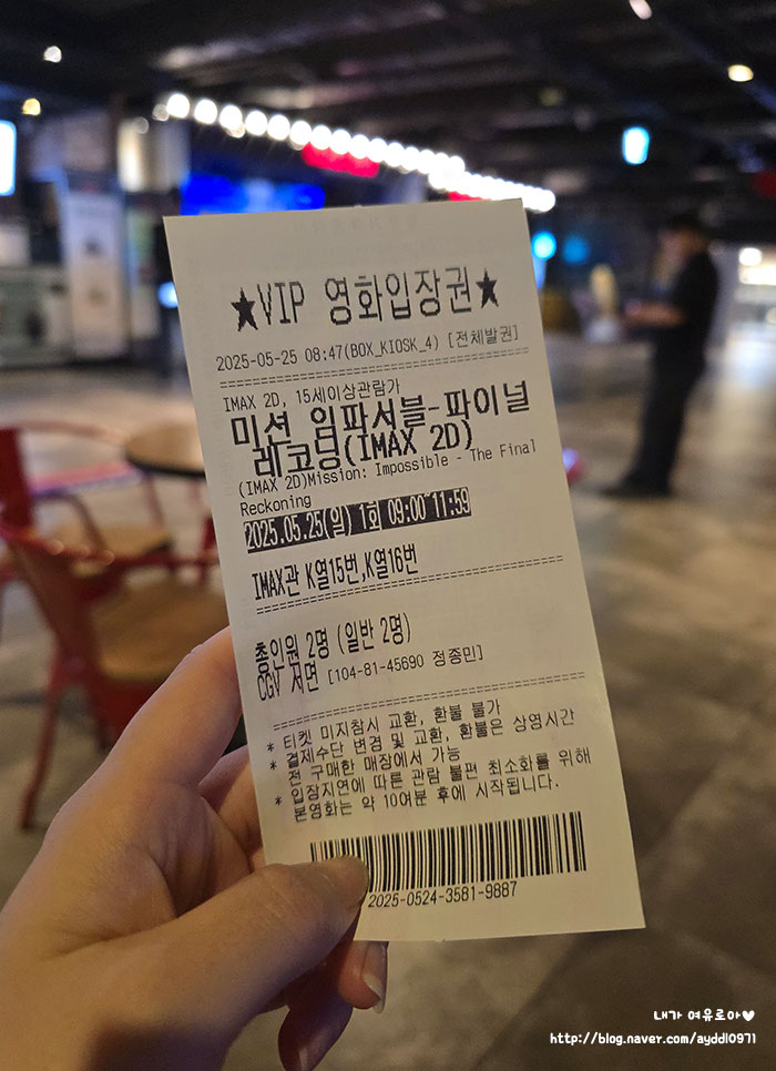 그래서 오랜만에 영화를 조조로 보고 왔는데요. 어우 요새 2025 조조영화 가격도 싸지는 않더라구요. 그래도 미션임파서블 파이널레코딩은 액션이 장난 아닌 만큼 아이맥스로 보고 왔는데요. 아이맥스 조조영화 가격이 인당 14,000원이더라고요. 일요일 아침이긴 했지만 두 사람 영화값에 팝콘콜라 세트까지 하니 5만 원 금방이었습니다.